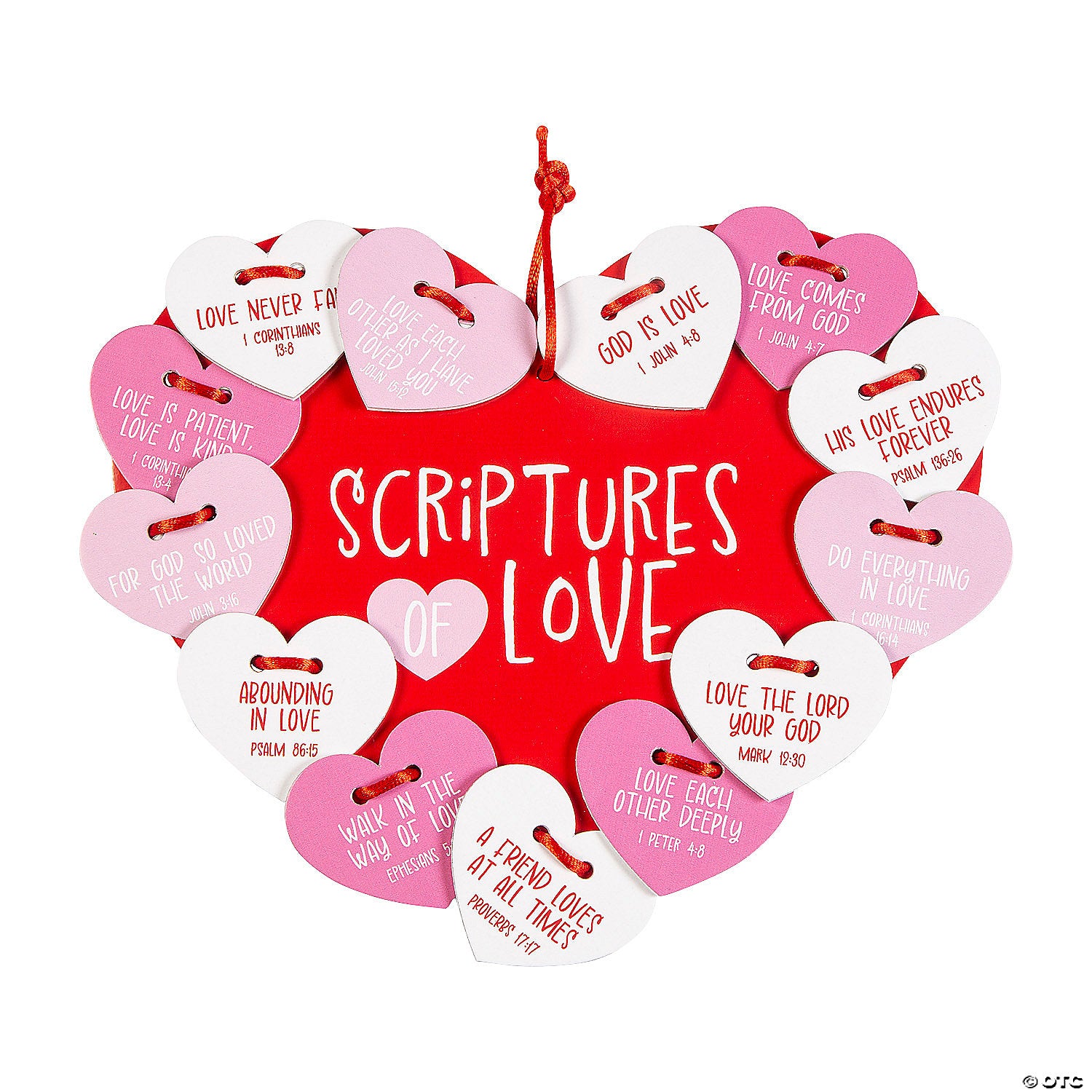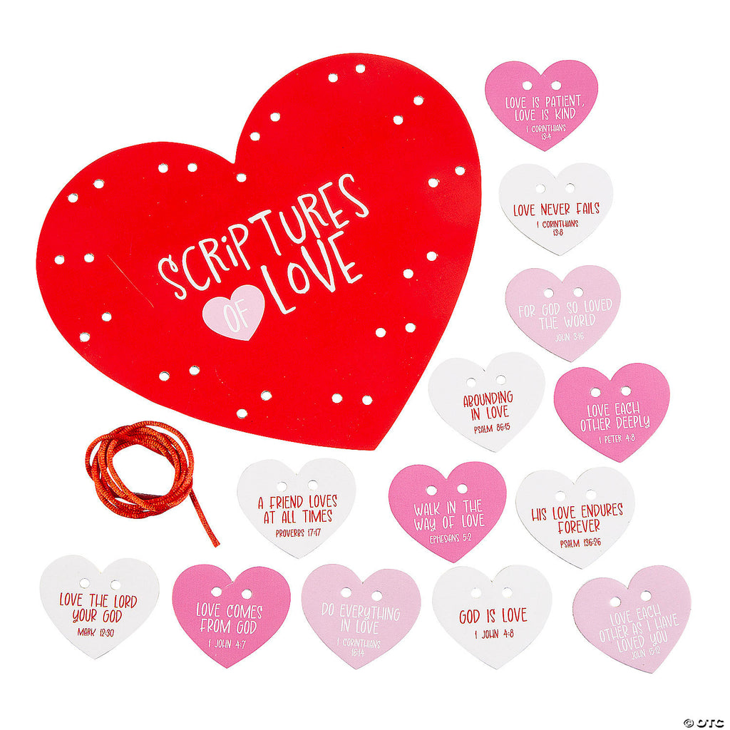 Includes foam Scripture heart cutouts and satin cording.